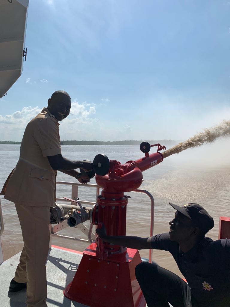 Chief Fire Officer Marlon Gentle of the Guyana Fire and Rescue department commented that the Firefighting vessel will improve the country's fire service marine firefighting and response capability as it will be able to pump in excess of 5,000 gallons of water per minute. Gentle stated, ‘It heralds the need for this type of equipment so that we can have some sort of port protection for our storage, our wharves, warehouses and so on the waterfront, and also a fireboat is also a very useful piece of equipment for shore support in terms of land based firefighting operations.’